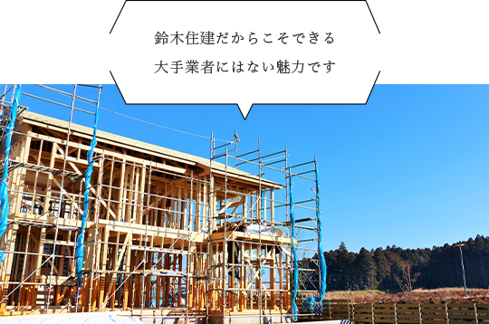 大手ハウスメーカー等は、お問い合わせや打合わせを自社で担当し、施工は下請け業者に任せるのが一般的ですが、鈴木住建はすべての工程を一貫して担当する「自社施工」です。